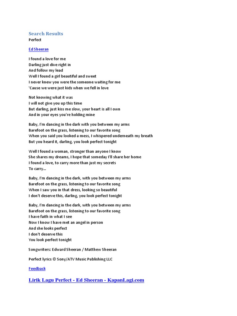 Ed Sheeran Perfect Lirik Arti 18 Sep 2021 Posting Komentar Perfect I found a love for me Darling just dive right in and follow my lead Saya menemukan cinta untuk saya Darling hanya menyelam. Perfect Ed Sheeran Lirik.